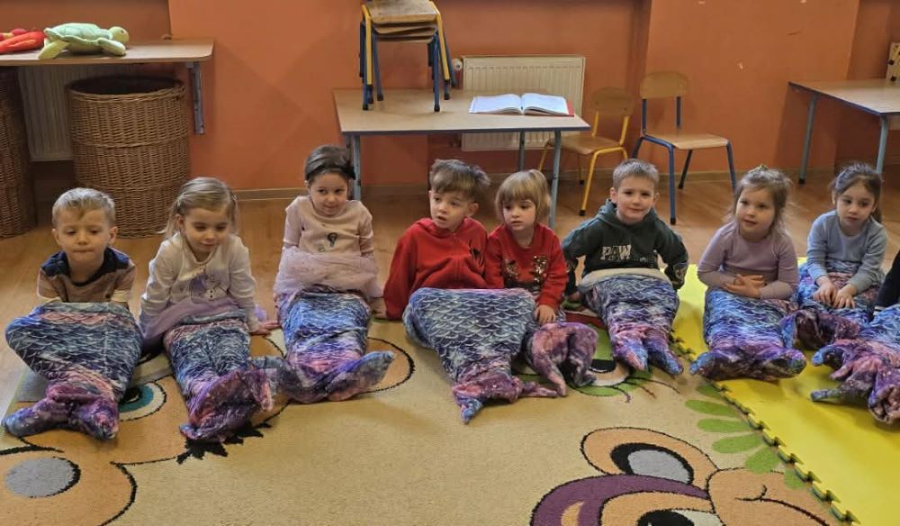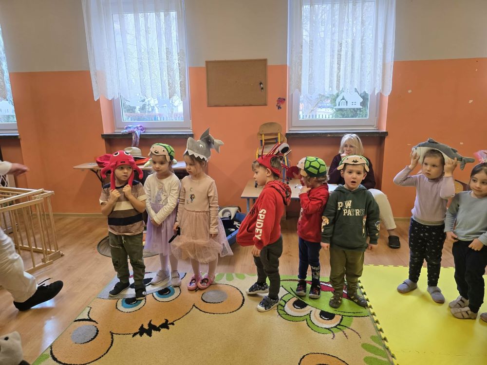W ramach bogatego programu aktywności zaplanowanych na tegoroczne ferie, dzieci z grupy I i II wzięły udział w wyjątkowym wydarzeniu, jakim były „Interaktywne warsztaty w oparciu o Legendę o Syrence”. Nasze przedszkole odwiedził profesjonalny animator, który dzięki przywiezionym ze sobą, baśniowym dekoracjom w mgnieniu oka zamienił salę w magiczną krainę. Warsztaty miały niezwykle angażujący charakter – pan prowadzący z wielką pasją opowiadał historię Syrenki, a nasi mali słuchacze nie byli jedynie widzami, lecz aktywnymi uczestnikami tej opowieści. Aby dzieci mogły w pełni wczuć się w morską atmosferę, otrzymały kolorowe nakrycia głowy imitujące najróżniejsze morskie stworzenia oraz kocyki, które na czas trwania bajki zamieniły się w prawdziwe syrenie ogony. Ta niezwykła charakteryzacja sprawiła, że przedszkolaki z ogromnym przejęciem odgrywały sceny z legendy, płynąc przez wyobrażone fale i odkrywając tajemnice Wisły. Interaktywna forma zajęć, łącząca słowo mówione z rekwizytami i zabawą ruchową, pozwoliła dzieciom w przystępny i pełen emocji sposób poznać jeden z najważniejszych polskich symboli. Radość, jaka towarzyszyła tej podróży w świat fantazji, była najlepszym dowodem na to, że ferie w przedszkolu mogą być czasem pełnym pasji i twórczych odkryć.