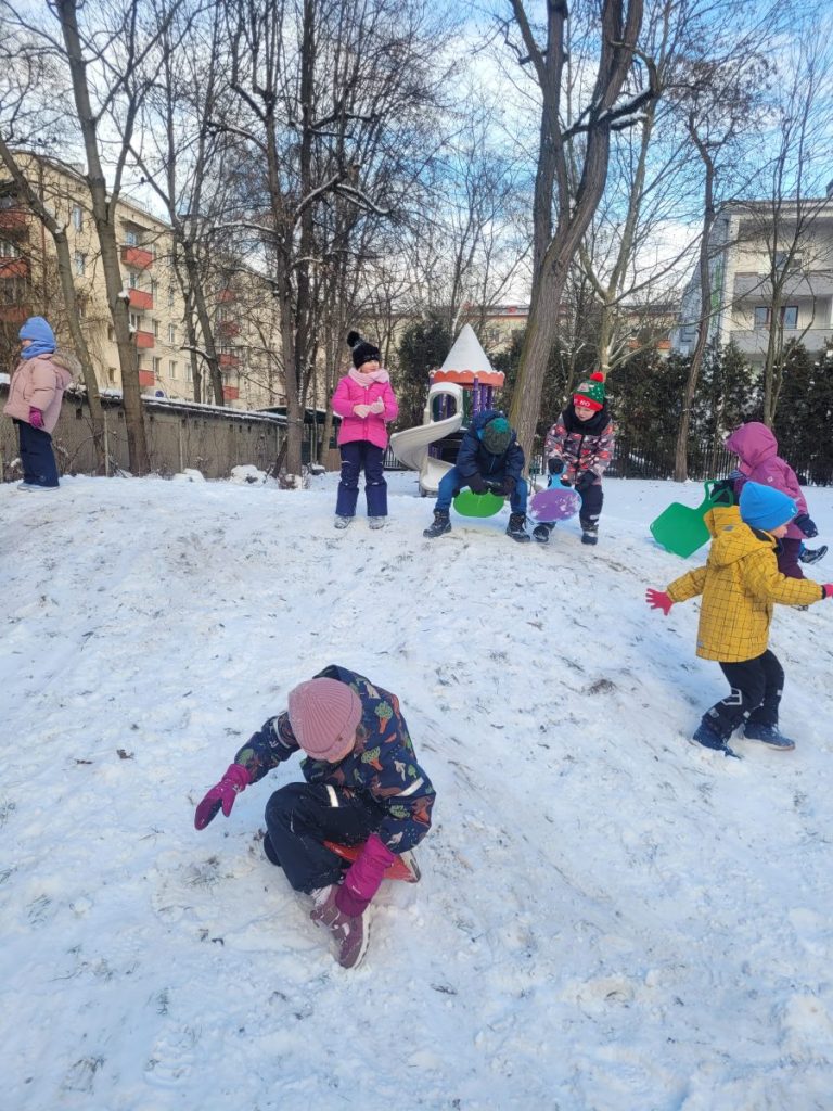 Przedszkolaki z ogromnym entuzjazmem zjeżdżały na sankach, ćwicząc odwagę, równowagę i… umiejętność wspinania się pod górkę po kolejną porcję emocji. Radosne okrzyki, rumiane policzki i szerokie uśmiechy były najlepszym dowodem na to, jak wielką frajdę sprawiła nam ta zimowa przygoda.