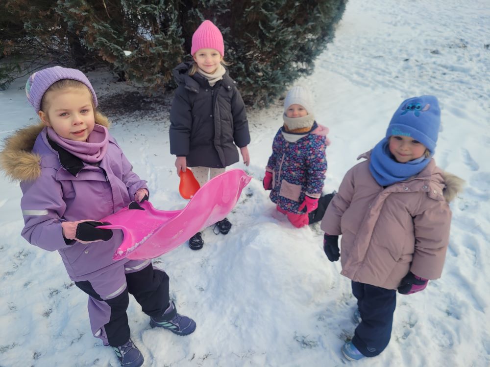 Korzystając z prawdziwie bajkowej, zimowej aury, wybraliśmy się z dziećmi na teren przedszkola, by w pełni nacieszyć się śniegiem, którego tego dnia naprawdę nie brakowało! Biała, puszysta kołderka przykryła naszą górkę, zamieniając ją w najlepszy tor saneczkowy w okolicy.